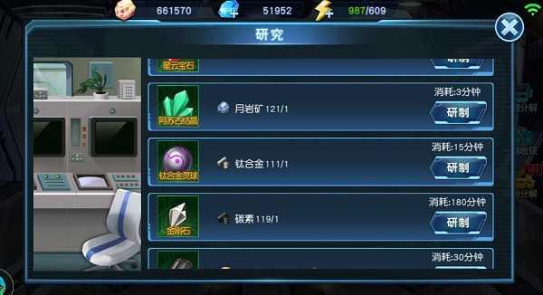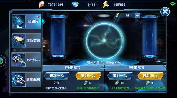首先是科研所功能,科研所的研究月耀石每天可以免费研究5次,每次30分钟的CD,研究可能获得英雄碎片、英雄经验提供石或者奥特曼英雄纹章,研制需要消耗离子能源,离子能源可以用钻石购买,小编个人建议免费研制用完之后,有需要的话都选择研制十次,毕竟十次必得10个英雄碎片,其中包括梦比优斯碎片。