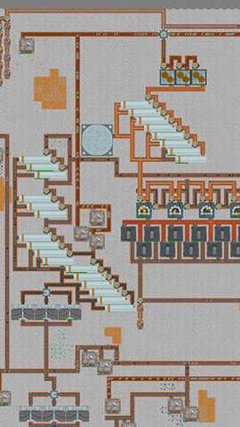 4、把各层布局考虑好。就开始挖油把,有开始需要电,后面都是大量缺点,最开始发电设备用水车,然后是汽轮机一直用到解锁太阳能,燃气轮机就不建议用了,用不起啊,耗资源太多。关于汽轮机发电,用了三层布局,也是参考大佬布局,附图,注意汽轮机在中间层,上层水泵和冷凝器,下层燃料