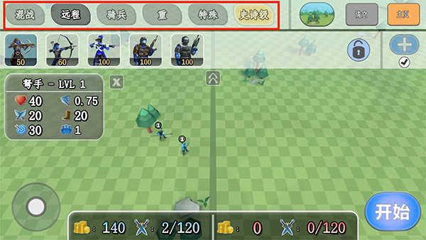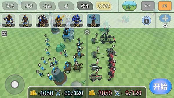 2、进入战场,包括混战、远程、骑兵、重兵、特殊和史诗级兵种分类,玩家可以自行选择需要的兵种进行放置,