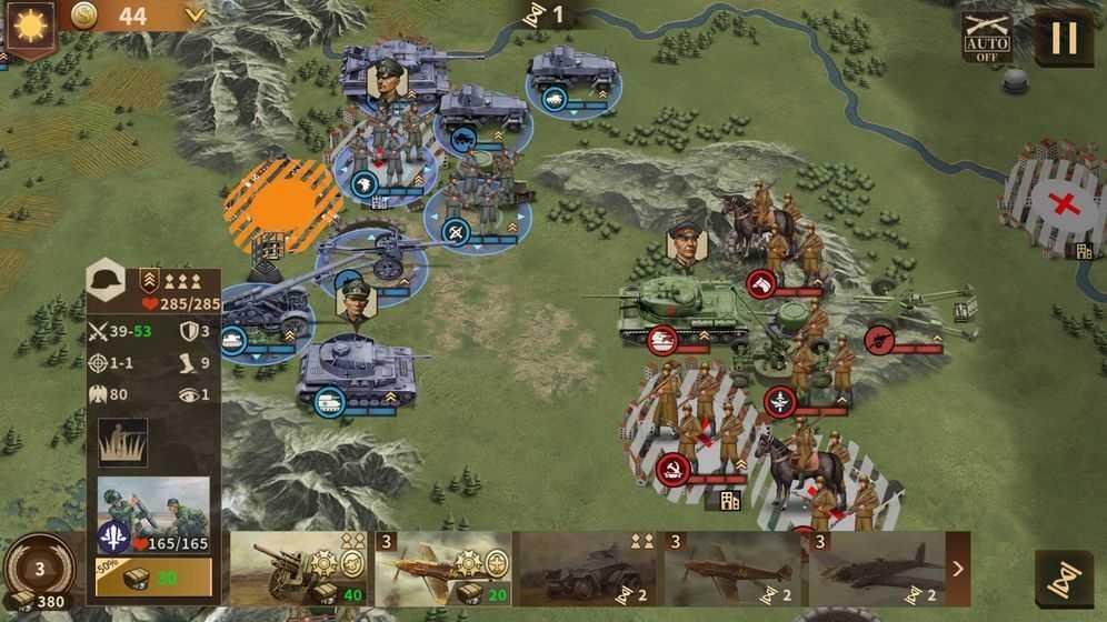 4、感觉用好伞降和急行军偷城压出兵点是很关键的破防线线手段。还有ai全是出完兵再行动,每次进攻格子里能动的兵都会上,结果你只要在出兵点边上留两个格子的兵,周围ai没援军的话很容易就能把出兵点偷掉。