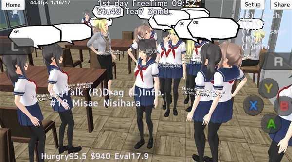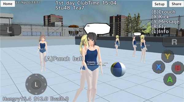 玩法:很普通的玩法,无僵尸模式,照着课表上课,吃东西,上社团活动,加入或退出社团,和学生老师互动,攻略学生并和学生恋爱,爬山玩水,開車,等...... .。