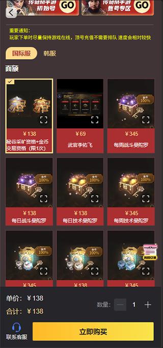 1、通过上方的链接,进入传奇M国际服手游代充页面,选择好需要充值的面额,以及数量,然后点击立即购买;