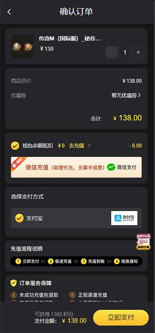 3、确认自己购买的商品无误之后,点击立即支付即可。最后,在订单页面填写号自己的游戏账号信息,以及联系客服即可。