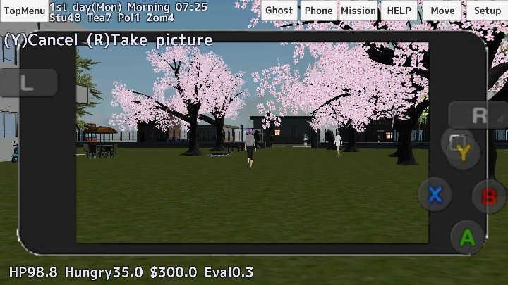 玩法:很普通的玩法,无僵尸模式,照着课表上课,吃东西,上社团活动,加入或退出社团,和学生老师互动,攻略学生并和学生恋爱,爬山玩水,開車,等…… .。