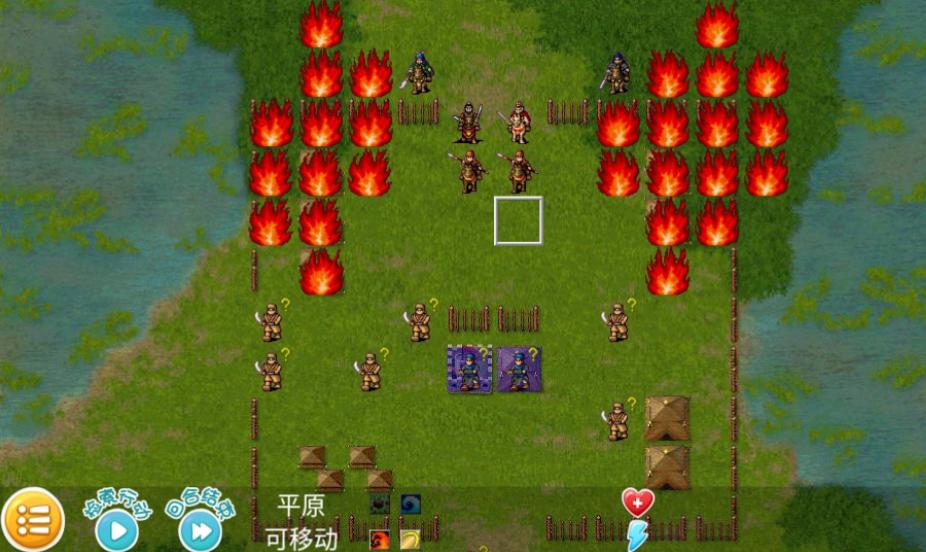 第2回合中,我们要先走到左侧张宝左上方的黄巾贼面前,卡住关羽走位。友军阶段,刘备等人会砍杀右边的黄巾贼。而敌军阶段,张宝由于有太平清领道会自动解混乱。