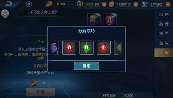 分解装备可以获得随机数量的元素石以及洗练石,要注意,分解的条件必须是紫色以上的装备,而合成没有限制