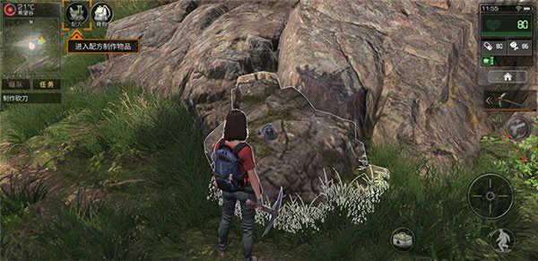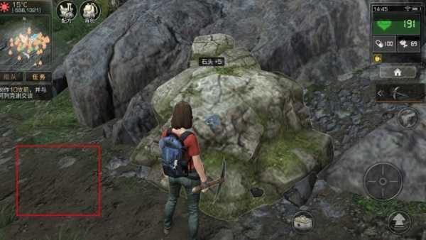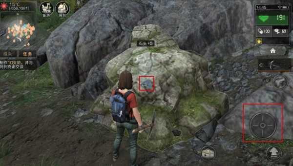 讲完移动的简单介绍,我们来说下如何获取资源!首先我们看到屏幕内是一个石头!我们换上挖石头需要的工具,然后看到屏幕中间有一个十字架,那是个准心,我们把准心瞄准需要开采的石头,然后点击右边的原型按钮,这时候我们就可以进行采集资源啦!