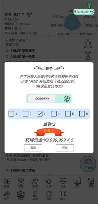 直接给长辈送钱,把自身属性刷满开始练武,资产有什么买什么。肝长寿基因和创业,会玩骰子就玩一下,其他时候主要靠运动项目和长寿基因。凑满十亿,第三世是相当自由的,就随便浪了。