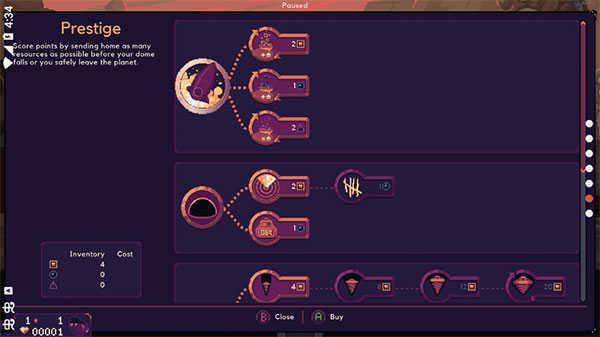 5、在穹顶中升级钻头的工作效率、角色的移动速度、牵引的承重重量,都在生存挖矿的过程中有着极为重要的作用。当然,如果玩家有幸通过遗物随机出“电梯”这项科技后,不仅可以将资源放到电梯上由电梯慢慢运送回穹顶,玩家也可以通过电梯轨道快速上下移动。