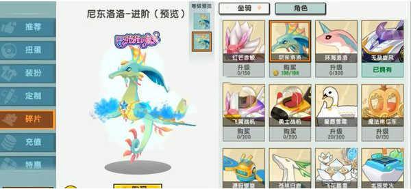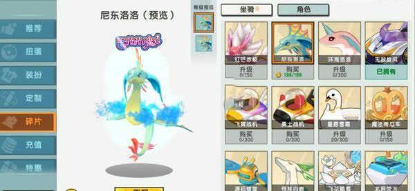 想要获取尼东洛洛坐骑的话,各位玩家们需要点击商城按钮,具体位置就在游戏开始界面的右下角,之后从左侧的定制和福利中间找到碎片这个选项,然后右侧一共有两栏,分别是
