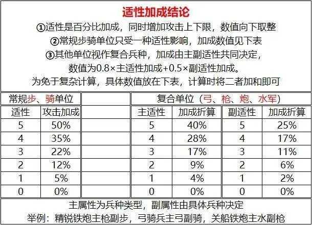 而其他四兵种则是,本适性*80%+副适性*50%=将领对应适性加成,即双适性加成