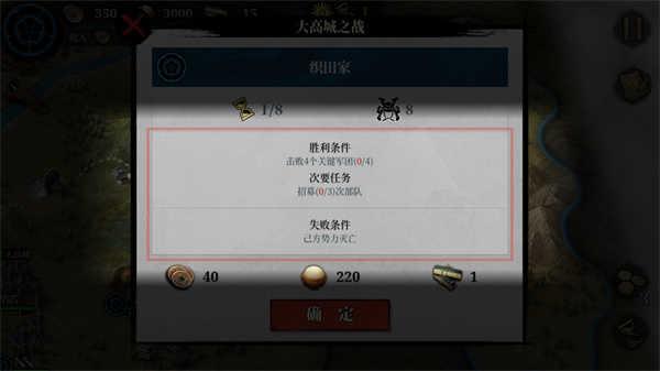 7、里面为玩家提供了主要胜利条件和次人物,主胜利条件决定游戏的胜利,次要条件不会影响胜利,但是完成的话将会会的奖励,点击确定,开始游戏;