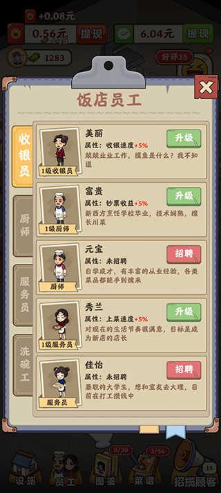 玩家点击屏幕下方员工,可以招聘和升级员工,但是是需要饭店好评才能升级和招聘。