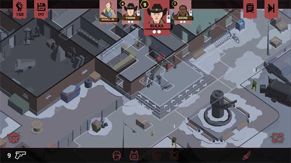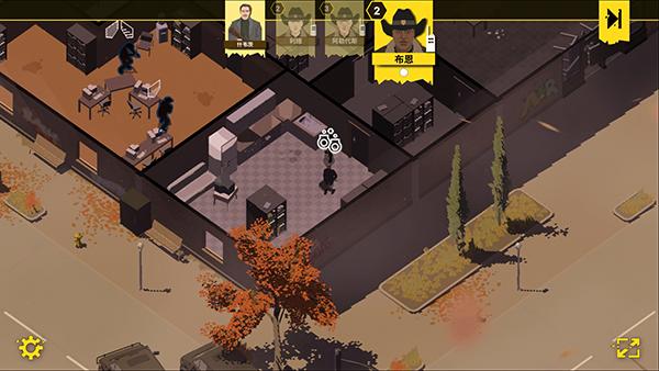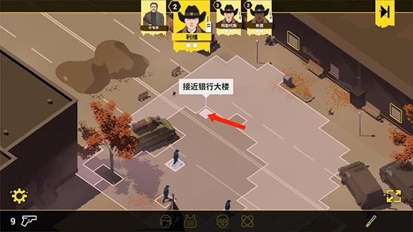 4、如图,提示接近银行大楼,点击图中标记的方块,一个警察通常每回合可执行两个动作,短距离移动会用掉一个动作,需要合理安排规划