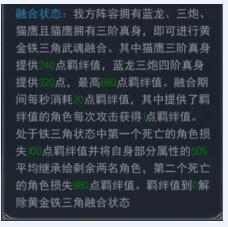 融合条件:猫鹰武魂达到3阶,这是最基本的。黄金铁三角的融合打法与剑骨不同,黄金铁三角更像是通过羁绊互相加成,而不是融合为一个机体。融合的概念不同,时间计算也不同,每局只有一次融合,融合时间受到各武魂真身的影响(如图)。