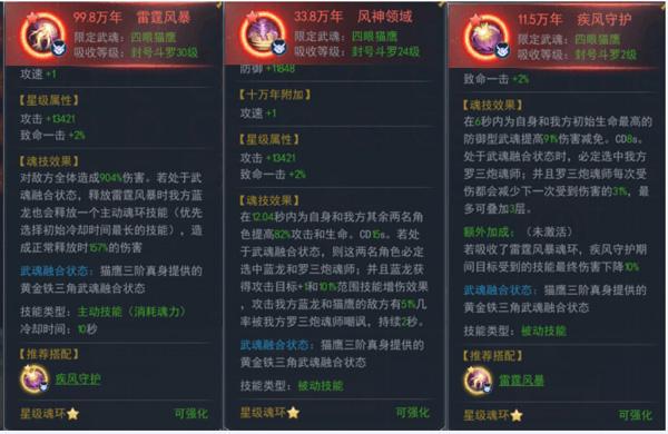 3、风神领域:对融合后的黄金铁三角的每个武魂提供攻击和生命加成,维持时间12秒(红一星),对比其他攻击加成类魂环(圣灵、怒火等)可见此加成的恐怖。另外还会对蓝龙特殊加成,其中攻击目标+1大家应该似曾相识,天使降临第三阶段的天使才能有此效果,融合后的蓝龙开局就存在。三炮增加嘲讽效果,保护蓝龙和猫鹰,嘲讽触发的概率达51%,保护效果也就非常明显了。