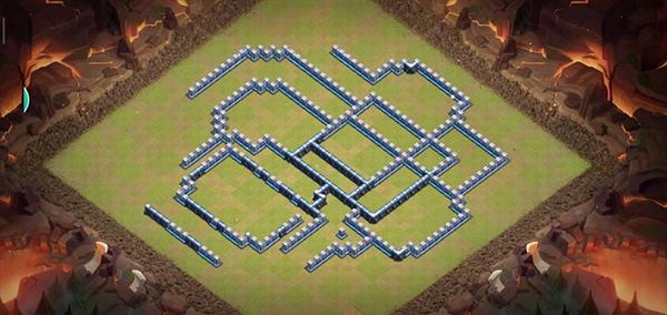 阵型解析:这是一个大本偏置的13本不规则格子阵,呈菱形的放置方法,大本与中心区域隔开放置。这种格局是一种比较常见的防守放置,对于陆军来说是需要弹跳或者地震才能穿透这个阵型的。火塔处均分散开,其中埋5电塔防止清边和引导部队走偏,也可以坑人。实测非常好用,适用于一般的部落战。