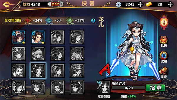 1、游戏中到达第二关卡就会开启“侠客”玩法啦,你可以通过收集碎片的方法来获得你想要的侠客伙伴,碎片可以在关卡和侠客岛副本中收集,当然,精力宝贵的玩家也可以在商城使用金条购买碎片,也可以通过礼包直接抱回家!