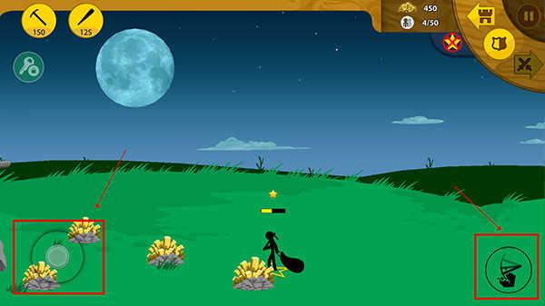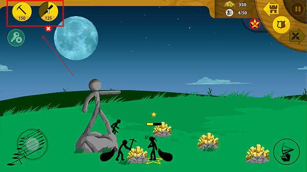 2、待玩家的战争矿产收集达到一定程度,便可开始训练您的战争士兵了,士兵的训练是需要消耗一定的金钱才能产生,训练好士兵之后,点击下图中的位置图标,便可挥舞你的火柴人军团去进攻敌人的营地。