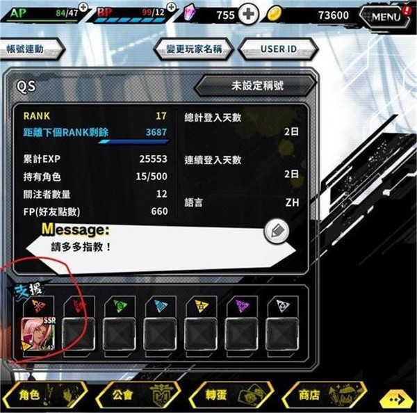 刷初始的第一目标是武器,而且最好是自己选择的角色的UR武器,在面板上很突出,效果也会更优越。注意武器有限定角色,所以如果开局出了UR武器但不是本角色的,又不想花钱去开新角色,建议直接重开再刷。有了UR武器之后最好的情况是还能够持有UR的支援角色卡,初始能够抽到可用的那就是最为理想的情况了。