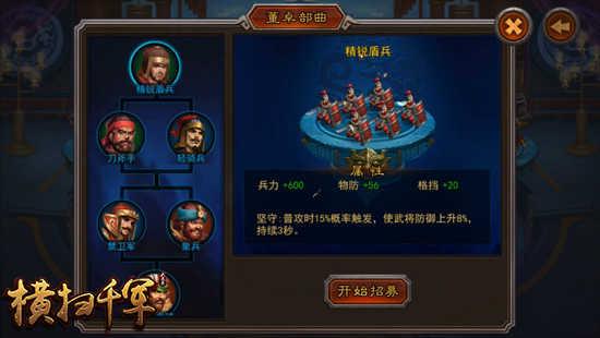 1:进入部曲界面后,需要手动选择某个武将,点击【开始招募】按钮,才可以进行该武将的小兵招募,如果没有武将处于小兵招募的状态,通关副本和屯田是不会获得募兵令的;