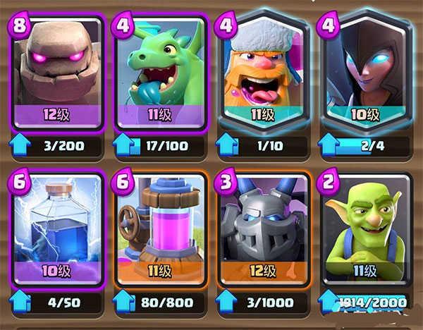 其中骷髅军团哥布林飞桶和火球、野蛮人滚桶、飞龙是必备的,骷髅墓碑和哥布林小屋可以二选其一,猎人可以替换成自己拿手的一张卡牌。