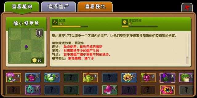 一般而言,大部分的植物子弹都只能向前面放,除了几个特别的植物外大部分的植物都没有自保能力,这个时候缩小紫罗兰的效果就显露无疑了,只是这个植物的冷却时间比较长,因此很少会有人选择带。