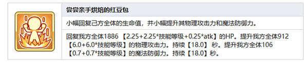 午餐时间+:中幅度提升自己的【1.0+1.0*技能等级】魔法防御力,并大幅度恢复【10.0+10.0+1.2*物理攻击力】自身的HP,再对自身展开【22.5+22.5*技能等级】物理魔法吸收的护盾。
