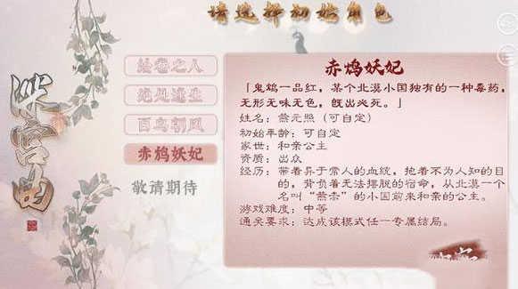 【赤鸩妖妃】和亲公主,有专属标签、剧情和五种成就,开局中位+被皇帝绝育,走剧情可为后但子嗣不为太子。无容予无太后。