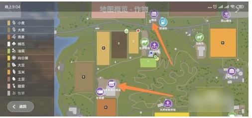 点开大地图我们可以掌握所有农田的状态以及不同农机所在的位置(后期农机数量多了以后靠切换车辆就比较浪费时间了,可以在地图上直接进入选定的载具),点击左右上角的符号切换你要查看的不同信息,包括:作物种类、生长状况、施肥情况、载具位置等。
