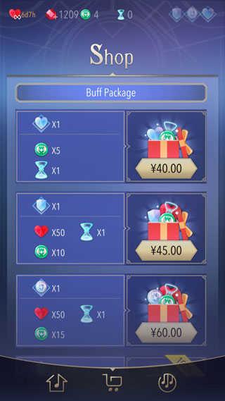 内购项目。图标一排三个,一并显示在主页面屏幕的右上角。购买后将点亮对应的图标。自左向右分别代表:开局佩戴护盾;每局首次使用复活道具时免费不消耗;每日2小时无限生命。