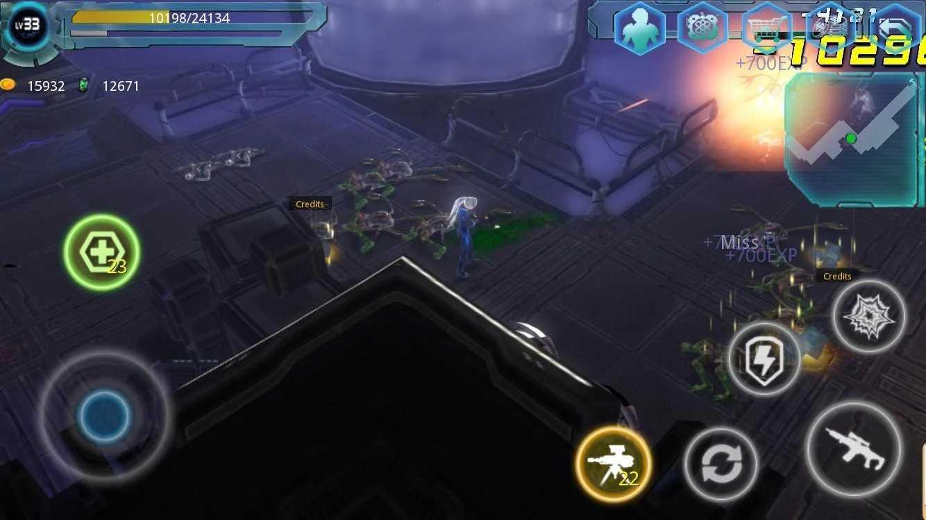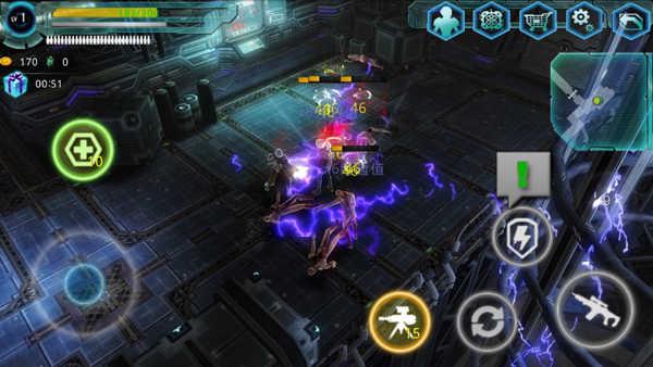 这款游戏的操作不是很难,进入游戏后玩家可以看到界面左下角有个圆环按钮,这个按钮是用来控制角色移动的,玩家想让角色往哪个方向移动就按住该按钮向哪个方向移动即可。玩家在移动的过程中要根据地面上绿色箭头的指示来,如果遇到异形生物的时候,玩家点击界面右下角带枪图标的按钮就可以发射子弹攻击目标,此外游戏中还提供了一个道具,那就是有黄色图标的机枪标志,当玩家点击该图标,就可以使用释放机枪塔自动攻击。