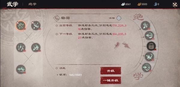 技能分为武学与绝学,释放武学没有消耗,而释放绝学则需要消耗怒气值。