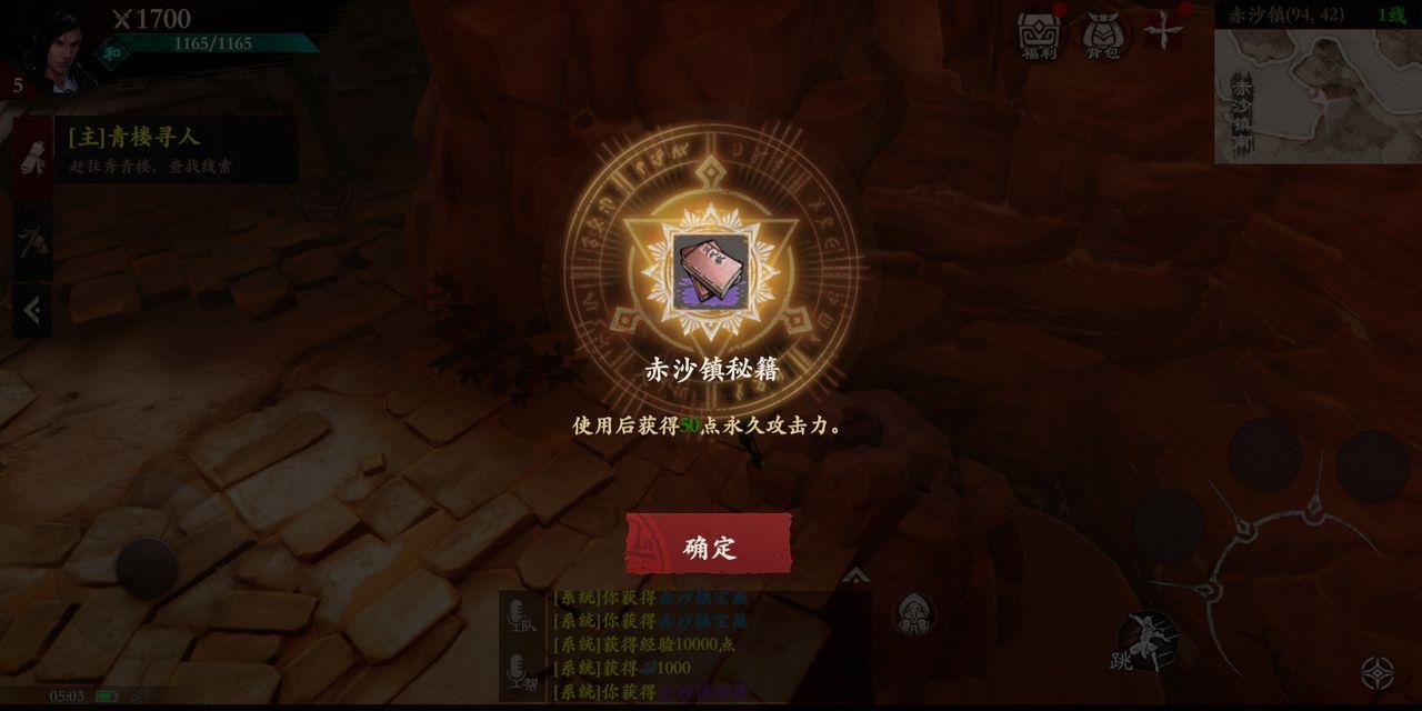 只要找完这四个,就可以来到坐标(94,42)找到赤沙镇宝藏了,而宝藏是一本秘籍,使用后增加50点永久攻击力。