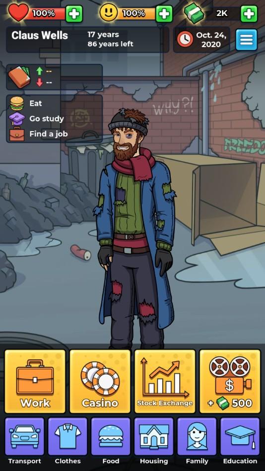 在这款游戏中你将从一名流浪汉开始,体验艰苦的生活以及逆袭的快感;