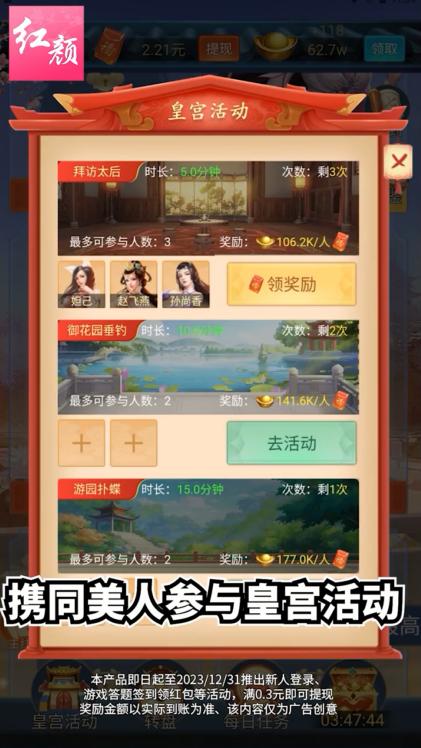 红颜模拟器红包版将你带入到古代朝廷中的生活中感受别样的宫廷体验,你需要和你的角色们一起参与到宫廷中的活动中去,在各种选秀等比赛中帮助他们获得好的名次,并在幕后对他们进行培养让她们的能力值得到升级,从而获得更大的魅力。