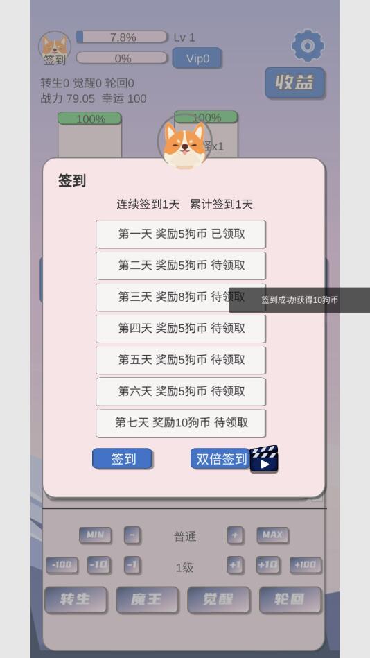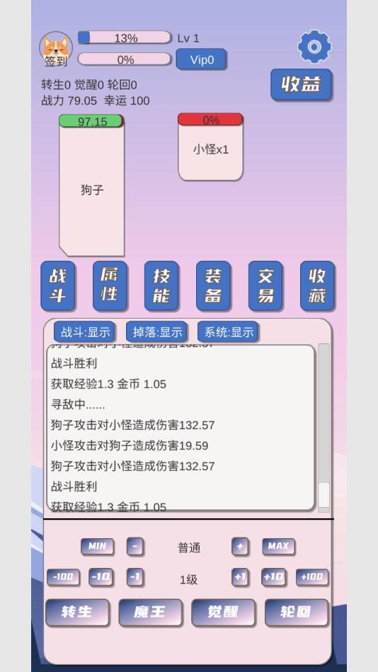 狗子放置游戏已经破解成了免广告获得奖励,在这款游戏中,玩家可以体验到高自由度的玩法,在这里一起的装备道具你都可以肝到买到,虽然是简单文字玩法,但是您能体验到玩法非常多,各种强化升星,击败大boss,给您带来成就感;