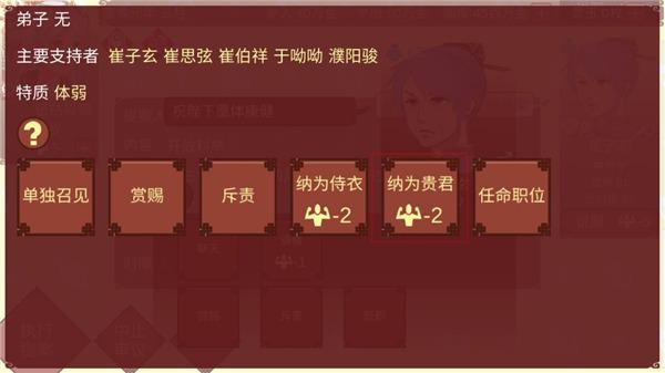 18、确定进行妃位变动吗?会产生以下影响中书令崔子玄忠诚+14乐苍州刺史夫人崔华似忠诚+4 g左散骑常侍崔卿恽忠诚+4,点击是;