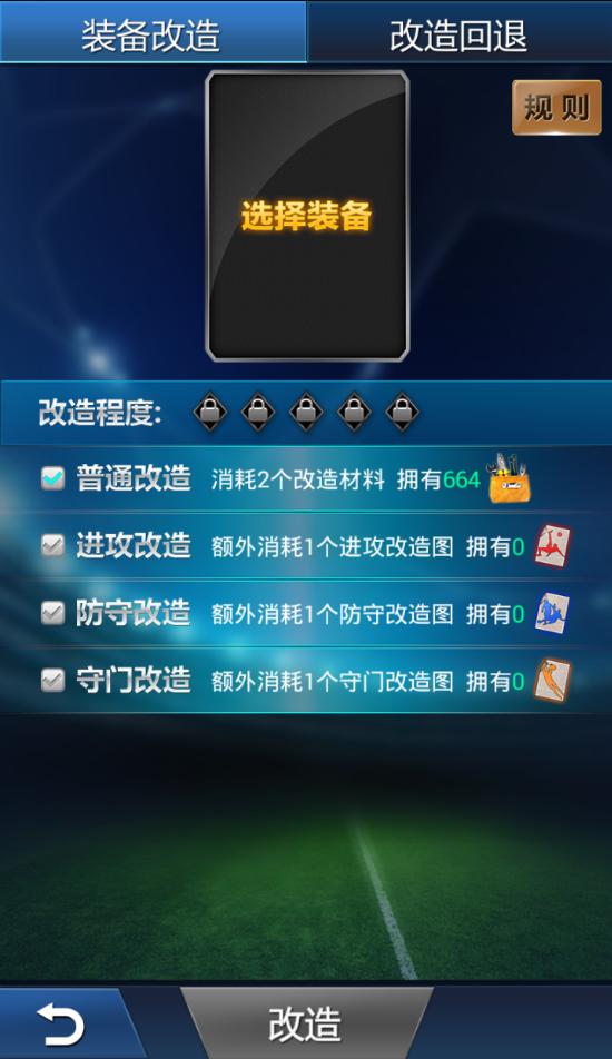 普通改造需要2个普通改造材料,每次改造消耗2个材料(随机进攻、防守、守门属性)
