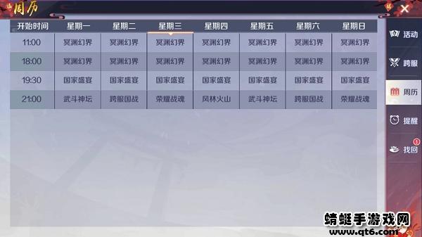 上面稍微讲完了等级和装备,那么下面就讲下限时活动拉~限时活动通常是能够拉开玩家差距的地方,限时活动主要包括了冥渊幻界,国家盛宴和晚上9点的活动。这个游戏整体还是比较良心的,就是不用太肝,在玩过了很多游戏之后,会发现有些游戏基本每隔一个小时就要上线一次。冥渊幻界是一个限时BOSS本,国家盛宴主要是提供经验加成的地方,而每天9点的活动是一个新玩法活动,这个玩法最好都能参与,因为提供的奖励真的比较丰厚,实在没时间参与也可以通过第二天寻回,所以也不用担心。其中武斗神坛和荣耀战魂是PVP的玩法,可以跟跨服的玩家PK,一决高下。跨服国战是国战玩法,不同服的国家互相PK,占领城池;风林木火是公会玩法,不同公会PK,决胜出最强公会,公会会长还有额外的奖励哦!