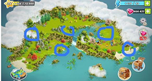 图中圈起来的位置,就是五个宝箱所在的大体位置。有些岛屿玩家因为等级原因还不能进入,只要等级够了,岛屿自动就会为你开放,你就可以收集五个宝箱啦。