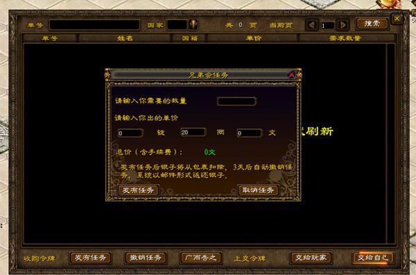 玩家可以通过兄弟会交易令牌来各取所需。如果你需要从其他玩家手中收购令牌,可以点击“招贤榜”,输入你所需要的令牌数量,能出的单价,然后发布任务。发布任务后,银子将从包裹中扣除,3天后自动撤销任务,系统以邮件形式返还银子。