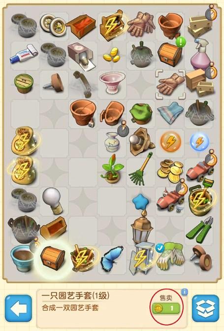 (PS:带闪电标志和计时器的是产出源道具,不带闪电标志的是合成道具!产出源道具会随机产出不同的合成物品。)