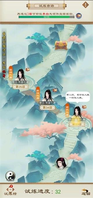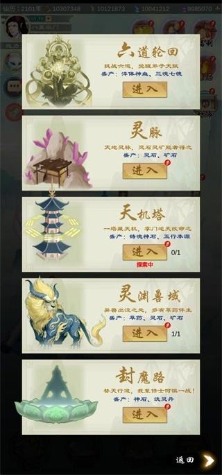 ③试炼古路:类似爬塔,可以获得极品灵石、丹药、法宝以及弟子,不能重复获取。