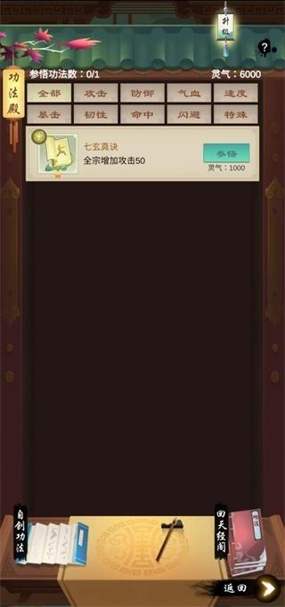 ②功法殿:顾名思义参悟功法的地方,参悟一门功法可以为全宗门提供属性提升,当功法学习到了一定程度,甚至可以自创功法。