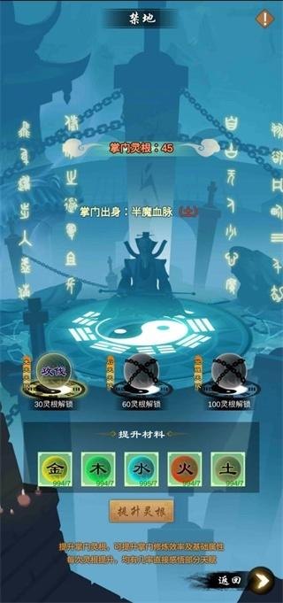 ③后山禁地:五星宗门后解锁,后山禁地是掌门专属战力提升,初始废灵根的掌门灵根只有10,可以消耗五行本源来进行提升,同时也可以消耗五行本源与禁忌魔石来回忆掌门天赋,直接提升掌门的五维。