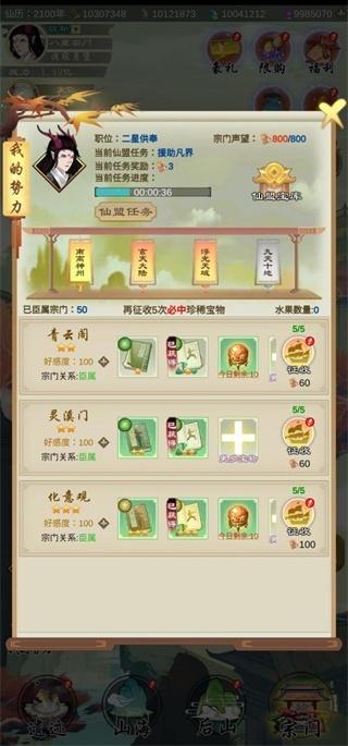 第二种方式就是向自己的臣服宗门征收资源,完成仙盟任务→获得宗门声望→消耗声望征收资源→有概率获得臣服宗门的修炼功法。