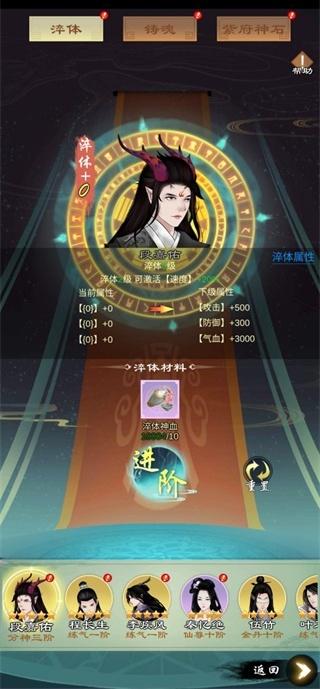 淬体可以类比为强化,主要使用淬体神血,到了高级之后还需要消耗同品阶的弟子,能够提升攻击、防御、气血数值;