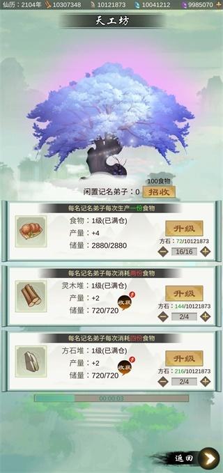 ②天工坊:后山收菜,主要产出灵木、方石两种资源,用于升级宗门建筑。