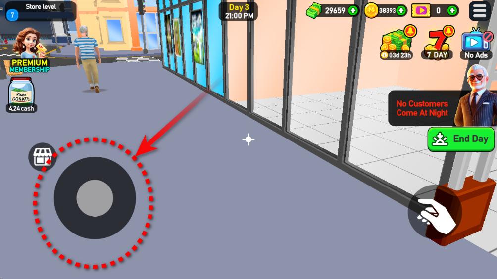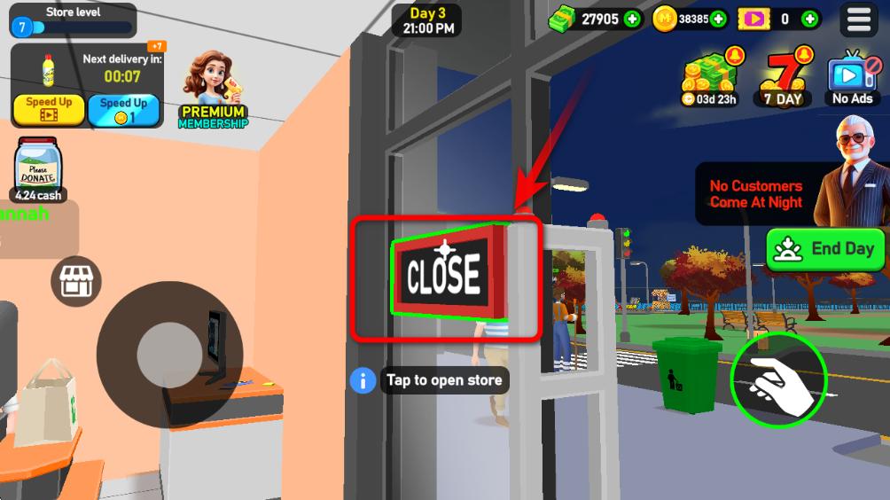 6.走到店铺门前,点击“CLOSE”按钮,将其切换为“OPEN”。